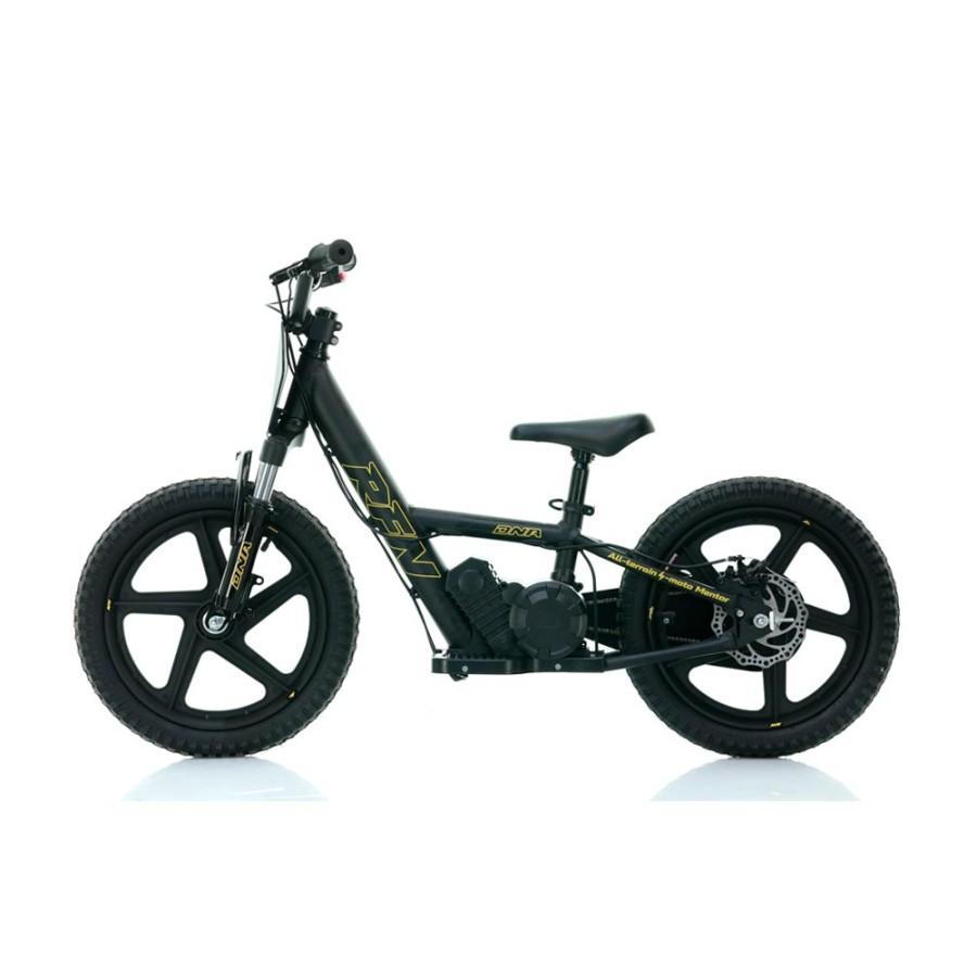 La bicicleta electrica infantil de 16" RXF Pro con suspension delantera en color negra y dorada, ofrece la combinación perfecta de rendimiento y diseño, brindando a los niños una experiencia excepcional.