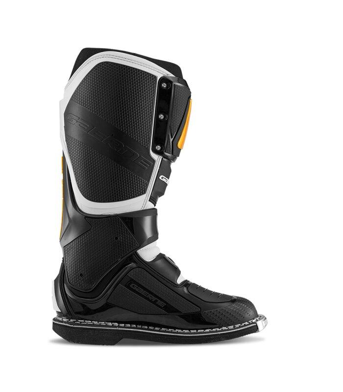 Dual Stage Pivot System: Sistema revolucionario patentado por Gaerne. El nuevo elemento de protección denominado RazorBack está anclado en dos puntos: el primero está fijo en el punto de rotación de la bota, y el segundo está ubicado en un ojal móvil, que facilita el movimiento de flexión natural, con un límite en ambos sentidos para evitar la extensión o compresión involuntaria y amortiguar un posible impacto. El RazorBack ha sido diseñado para ser sinérgico con otros elementos de la bota y gracias a un particular apéndice limita fuertemente el movimiento lateral que es una las causas más frecuentes de lesión. Esta sinergia garantiza un protección absoluta en toda la parte posterior de la bota.