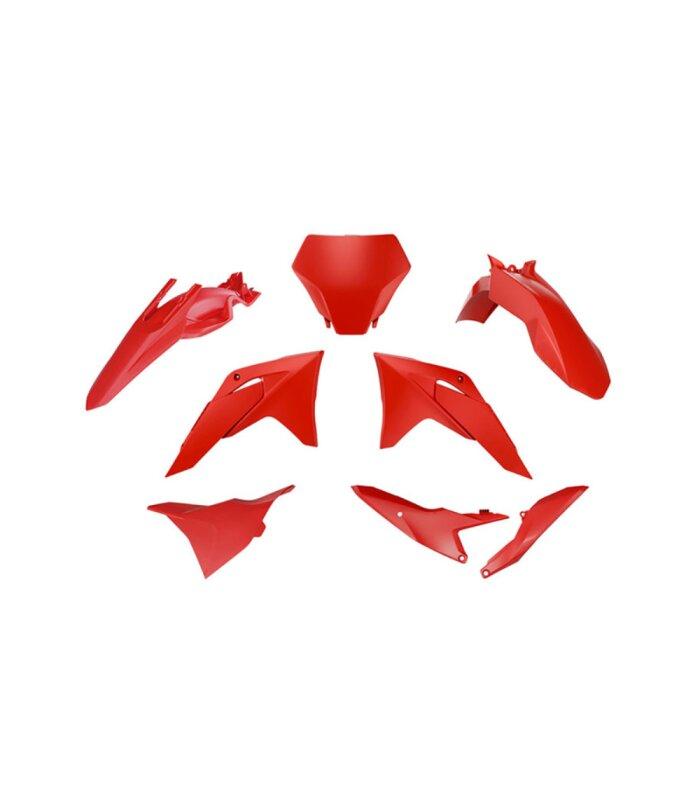 Kit de 6 piezas compuesto por guardabarros delantero, guardabarros trasero, tapas laterales, tapas de radiador, tapa de filtro de aire y placa frontal portanúmero.