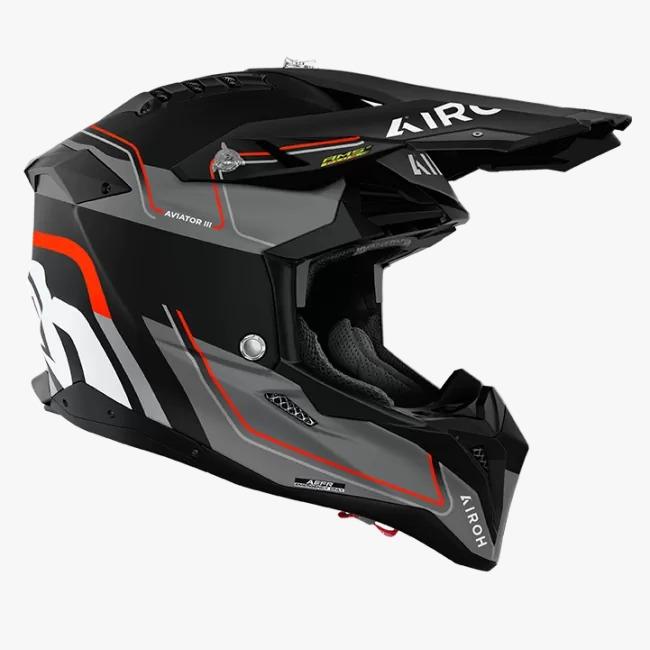 El casco off-road Airoh Aviator 3 dejando atrás a todos. Una vez más. Lo difícil no es ganar una vez, sino seguir haciéndolo. Aviator III sube el listón y redefine los estándares de un casco todoterreno. La calota, disponible en una versión de carbono (Carbon 3K) exclusivamente para el gráfico Carbon, está hecha de fibra noble (HPC Carbon) para las demás variantes gráficas. La calota exterior está disponible en cuatro tallas para ambas versiones y se diseñó utilizando el túnel de viento de Airoh para optimizar el diseño y el rendimiento. Por lo tanto, se prestó especial atención a la aerodinámica, con el objetivo de que el casco fuera estable incluso a altas velocidades, y a la termodinámica, para optimizar la termorregulación. La destreza tecnológica de Airoh se condensa en este nuevo producto, que incorpora los sistemas AMS2 Plus (Airoh Multiaction Safety System Plus), AEFR (Airoh Emergency Fast Release) y AMLS (Airoh Magnetic Lining System), que ha evolucionado para incluir almohadillas magnéticas para las mejillas. Las ocho tomas de aire y los alerones con extractores integrados hacen que el Aviator III sea cómodo de llevar incluso en las condiciones más extremas, al igual que el innovador AHS (Sistema de Hidratación Airoh) integrado en el EPS. Aviator III. Sin límites.
