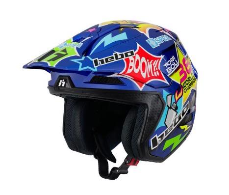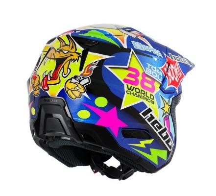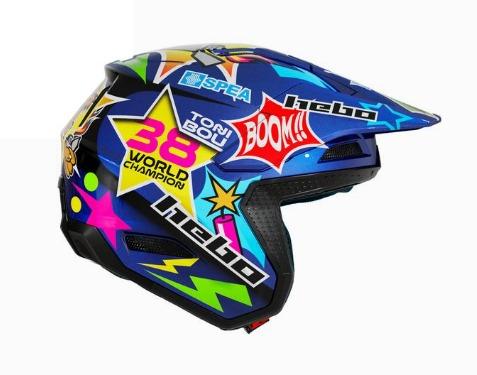 El casco de Trial Hebo HTR F02 replica e Toni Bou 38, es un casco de fibra de vidrio, totalmente desmontable y con espumas de diferentes densidades.